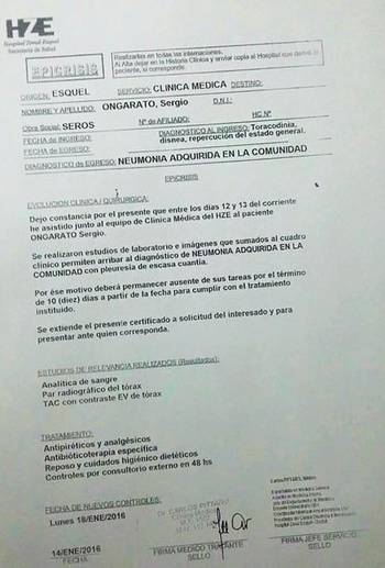 Se conoció el diagnóstico elaborado en el Hospital Zonal de Esquel al Intendente Sergio Ongarato. El mismo se encuentra atravesando un cuadro de neumonía adquirida en la comunidad con pleuresía de escasa cuantía.