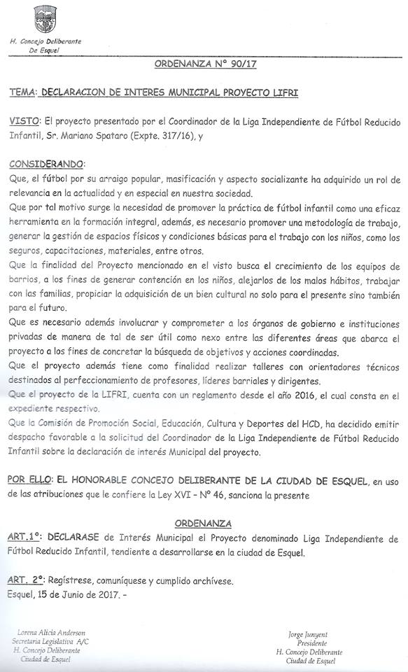 En la última sesión del Concejo Deliberante de Esquel, la LIFRI (Liga de Fútbol Infantil) fue declarada de interés municipal.