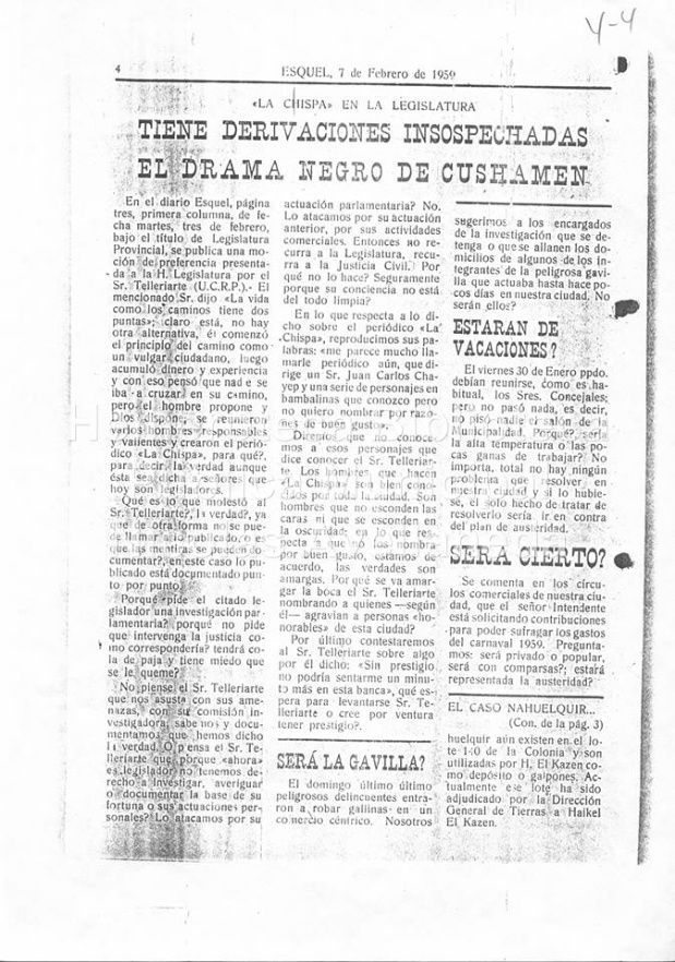 En el primer número, con el título “Es necesario tratar cuanto antes el tema de las tierras de Cushamen”, en La ChIsPa se publica un pequeño artículo que comienza diciendo: “Hace cerca de cuarenta años que el Estado entregó al jefe aborigen Rafael Nahuelquir un predio de 625 hectáreas en el lote 140 de la Colonia Cushamen, de acuerdo a la ley 1501 del 20/10/1899 que se refería a la adjudicación de lotes a la tribu Ñancuchi Nahuelquir en reserva especial de 200 lotes de 625 hectáreas cada una. Así comienza el detallado drama de la tierra en Cushamen realizado por nuestro corresponsal y que publicaremos en nuestras páginas a partir del próximo número. (…)”