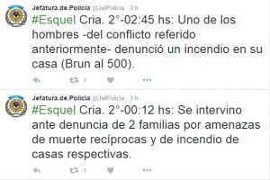 En los primero minutos de la jornada del jueves (00.12 hs), personal de la Comisaría Segunda de Esquel, intervino ante denuncias de dos familias por amenazas de muerte recíprocas y de incendio de casas respectivas. Dos horas más tarde, se presenta en dicha seccional, Juan Domingo Crettón, denunciando el incendio en su vivienda ubicada en calle Brun 540, por lo que tuvo que actuar Bomberos, Guardia de la Cooperativa 16 y Personal de Criminalística. Las pérdidas de la vivienda fueron totales, no hubo que lamentar personas heridas.