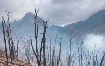 El fuego, iniciado por la caída de un rayo, se desarrolla en una zona remota del Lago Menéndez. Trabajan brigadistas, un avión anfibio y dos helicópteros, mientras varias sendas de alta dificultad permanecen cerradas.